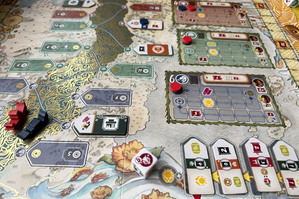Ein besonders reizvolles Element ist die positive Interaktion: Wenn ein Spieler ein Bauwerk errichtet, können auch benachbarte Klans davon profitieren – das verändert die Dynamik von Konkurrenz und Kooperation. Taktisch zählt nicht nur die eigene Strategie, sondern auch der Blick auf die Aktionen der Mitspielenden und das Timing, um Bonuspunkte zu sichern. Wer Aufträge erfüllt, erweitert seinen Einfluss, erhält Belohnungen und kann so im Laufe des Spiels an Macht gewinnen.